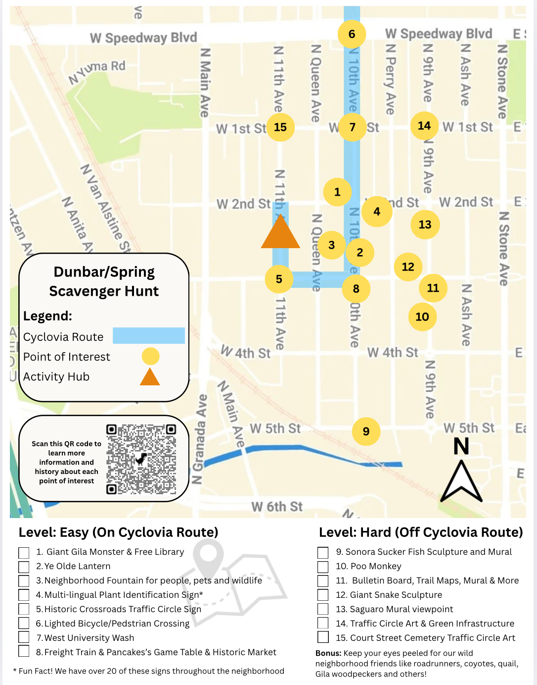 Tired of continually having to respond to proposed road widenings, increased traffic, and speed limits on the roads surrounding our neighborhood (and separating us from surrounding neighborhoods), neighborhood activists along with others from surrounding neighborhoods. led by Brad Lancaster and collaborating with planner/consultant Irene Ogata of Planners Ink, organized the Building Bridges Project in 2006 to identify barriers to human-powered transportation/connections between Dunbar/Spring and its surrounding neighborhoods, and how those barriers could be more safely crossed or “bridged”. The final plan was then presented to Mayor and Council, so the city would need to respond to what the neighborhood wanted, rather than the neighborhood having to react to what the city was proposing.